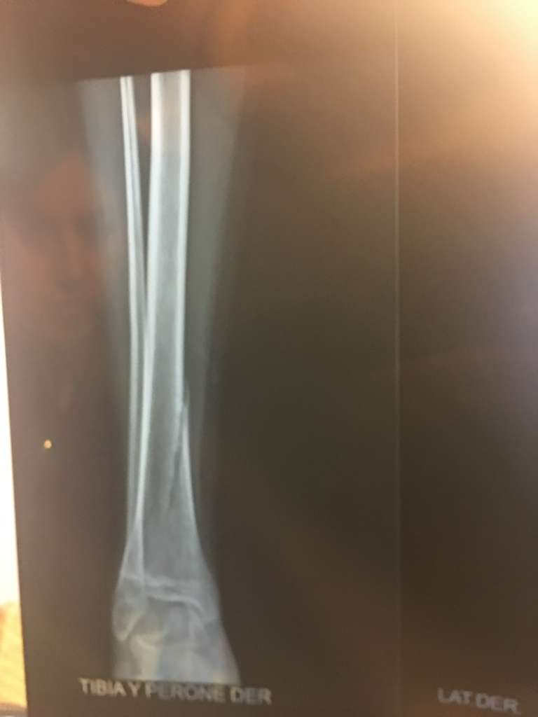- In the tibial diaphysis, an oblique, aligned disruption of bone continuity is identified.
